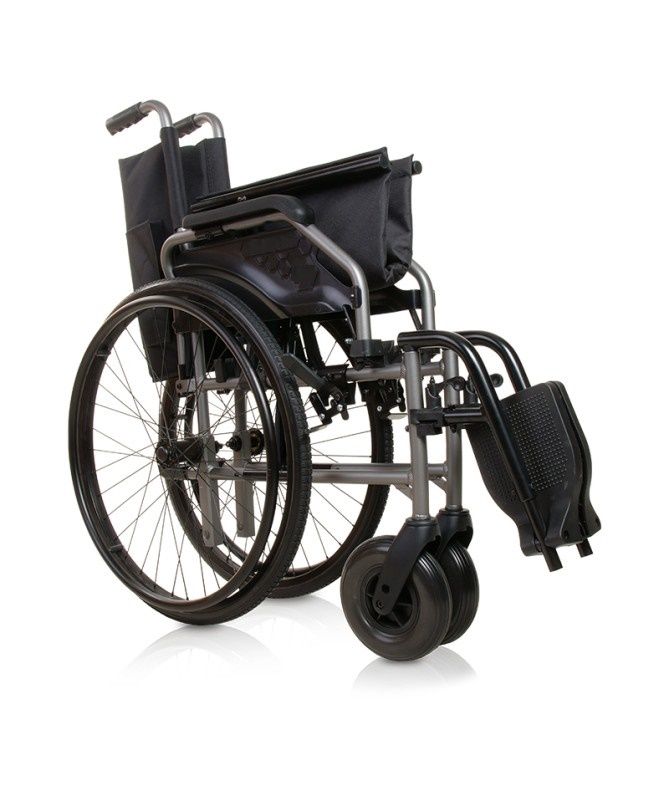 Silla de ruedas fabricada en aluminio y dispone de un sistema de doble cruceta para facilitar su plegado. Es muy ligera pero a la vez resistente, admitiendo un peso máximo de 120 kg.