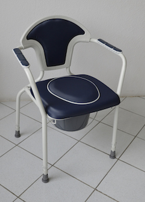 Silla habitación con WC que garantiza un uso muy cómodo debido a su asiento de espuma muy gruesa y sus reposabrazos. Asiento con tapa muy fácil de quitar por sí mismo. Cubeta extraíble desde un lado o desde arriba Asiento totalmente desmontable para limpiar. Estructura de acero epoxi gris y revestimiento de PVC impermeable en azul marino. Dos años de garantia. Dimensiones generales: ancho 60.5 x prof. 44 x alto 86 cm. Dimensiones de asiento: ancho 44.5 x prof. 36 x alto 49 cm. Alto Respaldo 42 cm. Peso 6,6 kg Peso máximo usuario 130 kg.